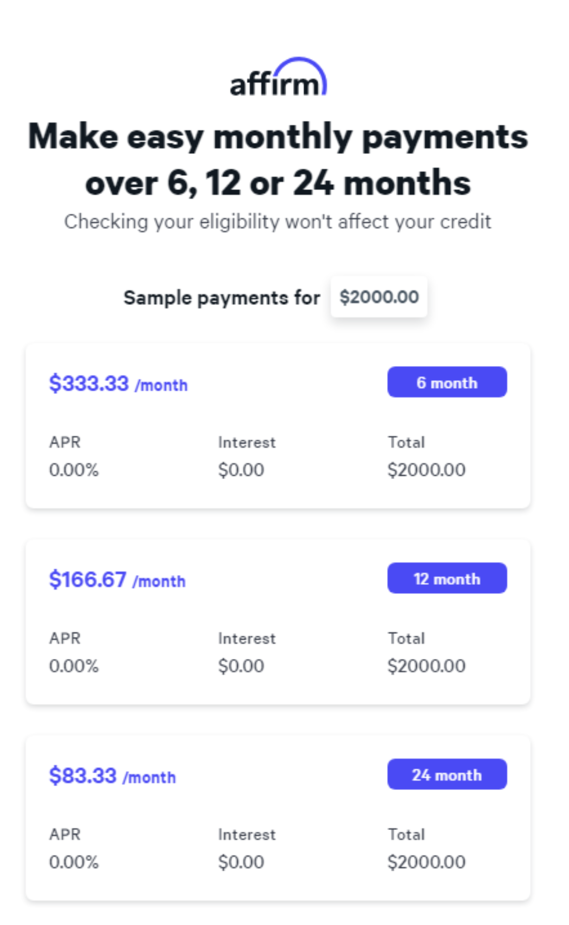 an eligibility check. Payment options through Affirm are subject to an